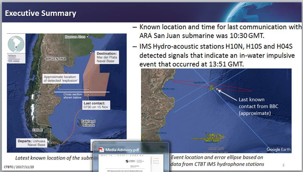 Looks like the possible explosion was detected by the Comprehensive Nuclear-Test-Ban Treaty Organization's hydrophone stations on Ascension and Crozet islands.A sound detected in the hunt for a missing submarine is "consistent with a non-nuclear explosion", Argentina has said.