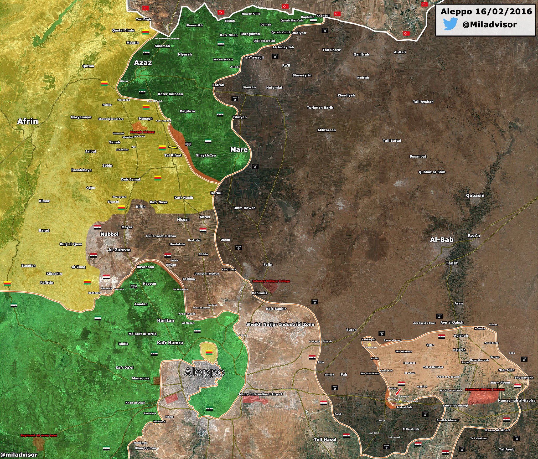 Note the map of Russian airstrikes in this link. They're clearly not just hitting around the SAA positions but along the entire Azaz corridor, right in front of the Kurdish lines. This is immediately prior to the Kurdish push across the corridor. This looks like Russian airstrikes in support of the Kurdish offensive.