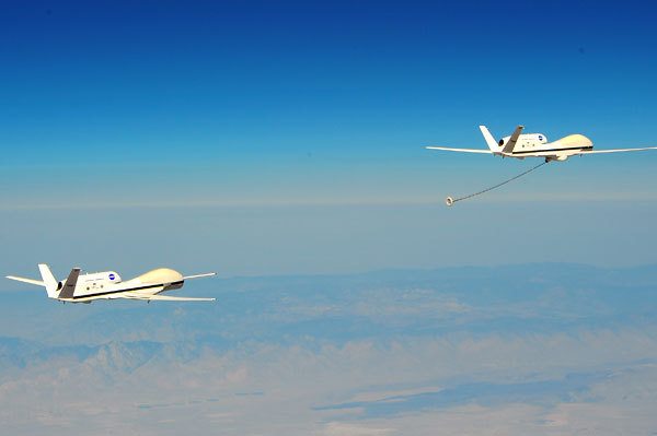 During its final test flight, two modified Global Hawk aircraft flew in close formation, 100 feet or less between refueling probe and receiver drogue, for the majority of a 2.5-hour engagement at 44,800 feet. This demonstrated for the first time that High Altitude Long Endurance (HALE) class aircraft can safely and autonomously operate under in-flight refueling conditions. The flight was the ninth test and the first time the aircraft flew close enough to measure the full aerodynamic and control interactions. Flight data was analyzed over the past few months and fed back into simulations to verify system safety and performance through contact and fuel transfer–including the effects of turns and gusts up to 20 knots.
