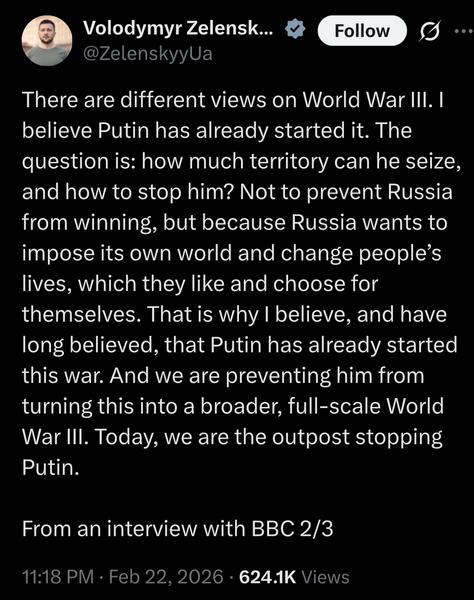 Zelensky does not seem to be overly inspired by the said plan and strongly believes that Putin had started the third world war and wonders how to stop him. Yet, he also strongly believes that “they” are currently preventing Putin from starting the third world war.
