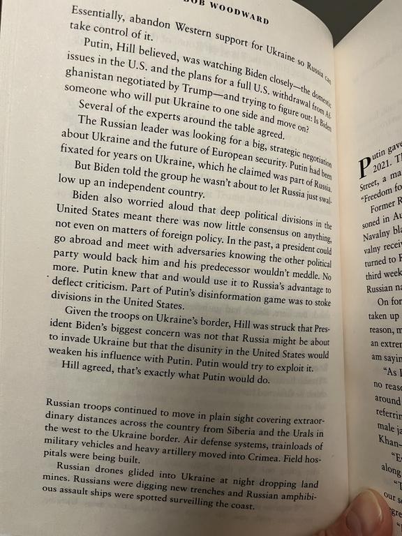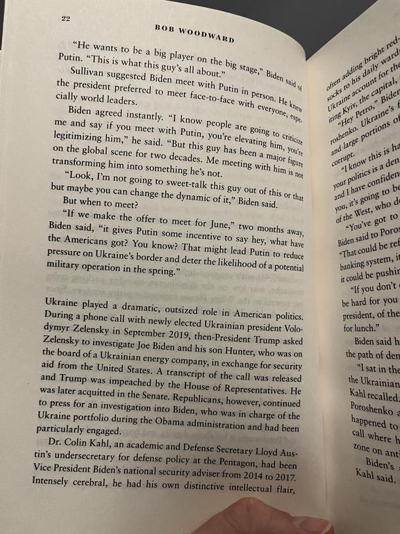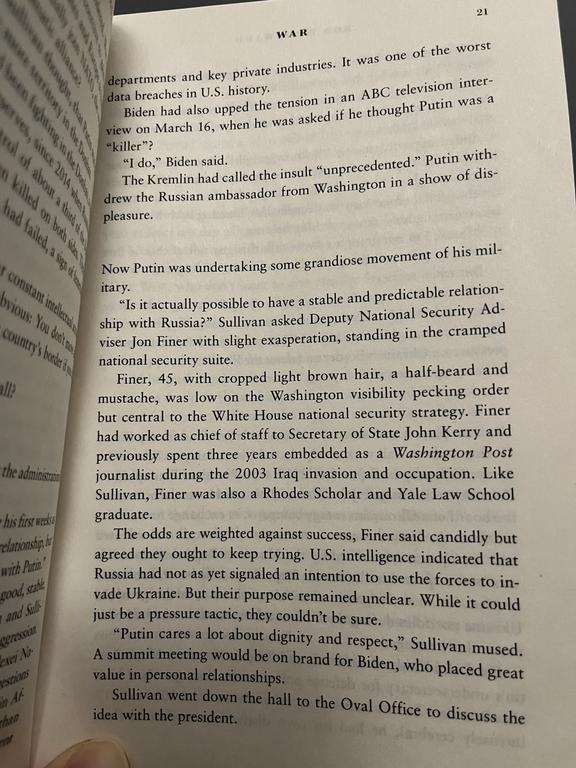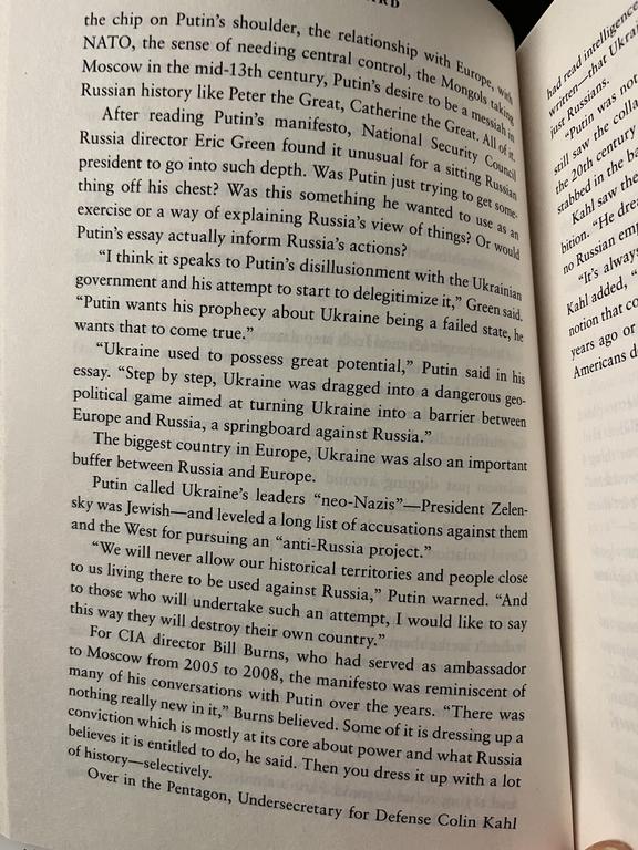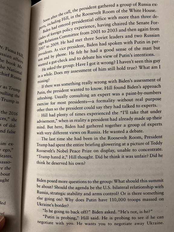 In my opinion, there is a clear illustration of Putin willing to work - read negotiate - with the US at this point. Another page prior notes that main agenda of the meeting was cybersecurity and they talked about Afghanistan as well; Ukraine, I quote (I do not want to insert another whole page here in order to stick with the copyright laws (local and the US), to have some contingency as to what happens next), “was barely a footnote in the conversation. Later, some would wonder if the failure to focus on it was a colossal mistake.” And “like dozens before: US talking points versus Russian talking points”. However, it is clear from Biden’s press conference talk that Putin had expressed the very concerns Russia (or he) has:
