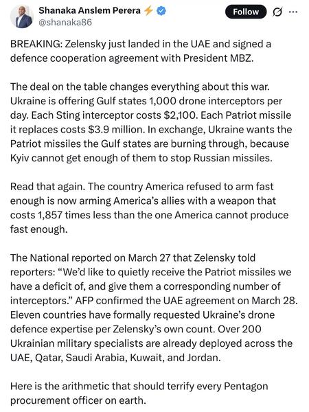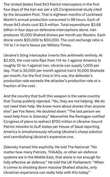 Imagine thinking that one can exchange some cheap drones with questionable performance (see one of my previous posts) - that one likely doesn't have (enough of - to begin with) for the Patriot interceptors that the US fully controls distribution of, has shortage of, and: