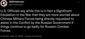 Things may be worse than they appear for russia. How bad is it if Russia is asking china for military aid? US intelligence won't say what military aid (equipment not dollars) Russia is asking for. I can understand the request for economic aid but if russia is short on any kind of equipment in just a little over 2 weeks, russia has to have lost more than we realize or a very large percent is non functional due to lack of maintenance. This might also explain the one or two trains headed towards Ukraine full of trucks and old beat up vans, they are desperate and are sending whatever they can get there quickly