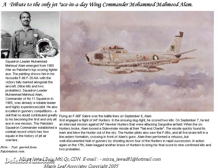 On 6th September, 1965, during an aerial combat over enemy territory, Squadron Leader Mohammad Mahmood Alam flying as pilot of an F-86 Sabre Jet, shoot down two enemy Hunter aircraft and damaged three others. For the exceptional flying skill and valor displayed by Squadron Leader Mohammad Mahmood Alam in operations, he was awarded Sitara-i-Juraat. On 7th September, 1965, in a number of interception missions flown by Squadron Leader Mohammad Mahmood Alam against the enemy aircraft attacking Pakistan Air Force Station, Sargodha, Squadron Leader Alam destroyed five more enemy Hunter aircrafts. In less than a minute , which remains a record till today. Overall he had nine kills and two damagers to his credit. For the exceptional flying skill and valour shown by him in pressing home his attacks in aerial combats with the enemy, Squadron Leader Mohammad Mahmood Alam is awarded a bar to his Sitara-i-Juraat.