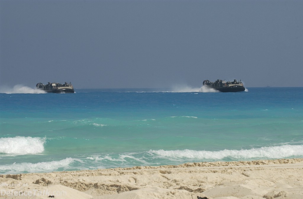Mubarek Military City, Egypt (Sept. 13, 2005) - Two Landing Craft Utilities (LCU) carrying U.S. Marines assigned to the 13th Marine Expeditionary Unit and Expeditionary Strike Group One from the amphibious assault ship USS Tarawa (LHA 1) ride along the beach during a rehearsal for a scheduled amphibious assault landing later in the week as part of ââ¬ÅBright Star.ââ¬Â Bright Star is multinational exercise held every two years in Egypt. This exercise is the largest and most significant coalition military exercise conducted by U.S. Central Command (USCENTCOM). U.S. Navy photo by Photographer's Mate 2nd Class Brandon A.