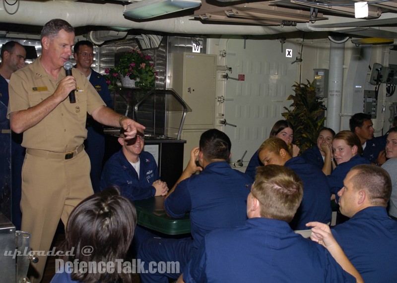 Vice Admiral Barry Costello, Commander, U.S. Third Fleet speaks to the crew of USS OKANE . OKANE is currently operating off the coast of Hawaii in support of RIMPAC 06. U.S. Navy photo by MC2(AW) Grant P. Ammon.