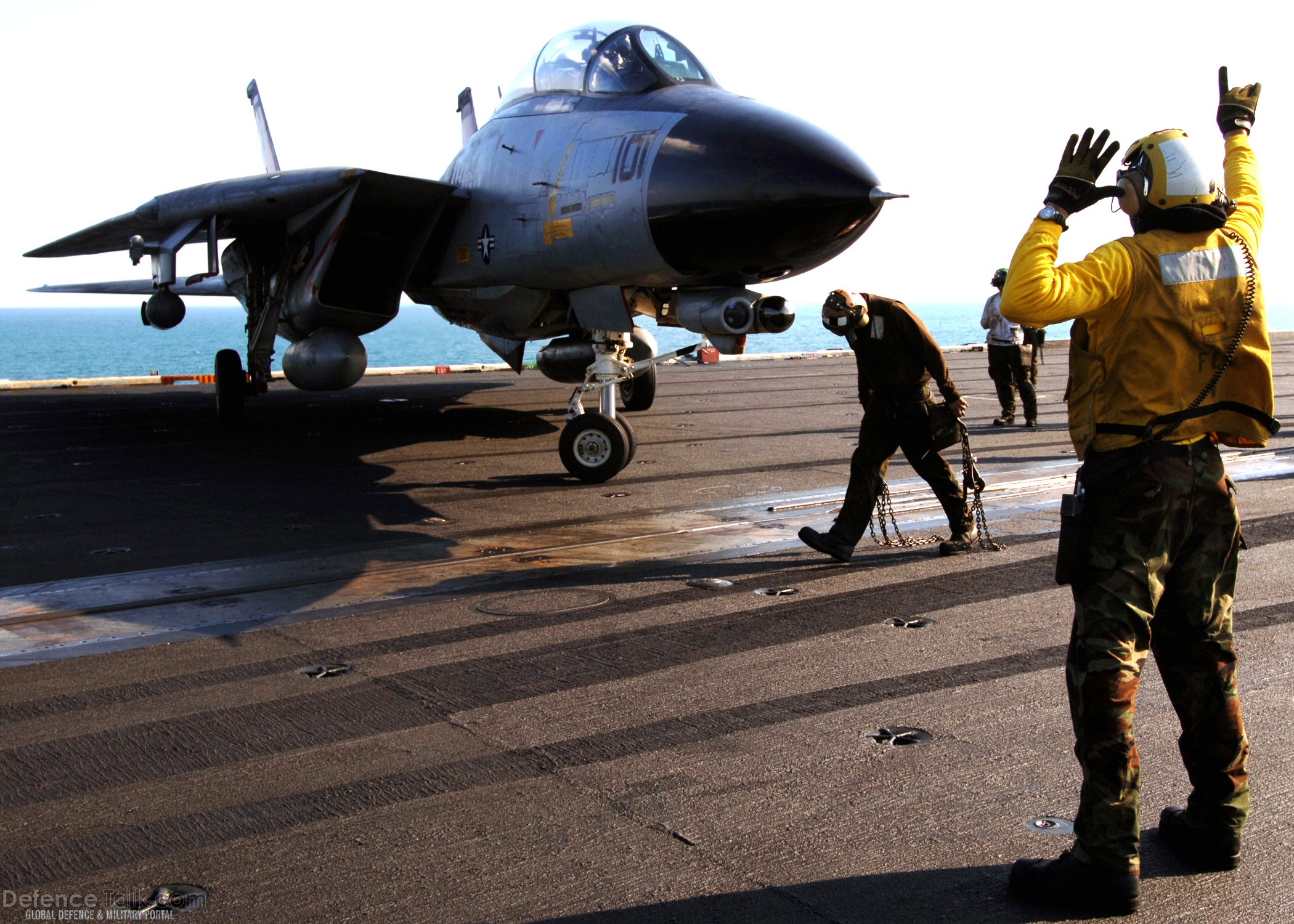 Persian Gulf (Jan. 19, 2006) - An F-14D Tomcat assigned to the "Tomcatters" of Fighter Squadron Three One (VF-31), is directed to a steam powered catapult prior to launch aboard the Nimitz-class aircraft carrier USS Theodore Roosevelt (CVN 71). Roosevelt and embarked Carrier Air Wing Eight (CVW-8) are currently on a regularly scheduled deployment conducting maritime security operations. U.S. Navy photo by Photographerâs Mate 3rd Class Michael D. Cole
