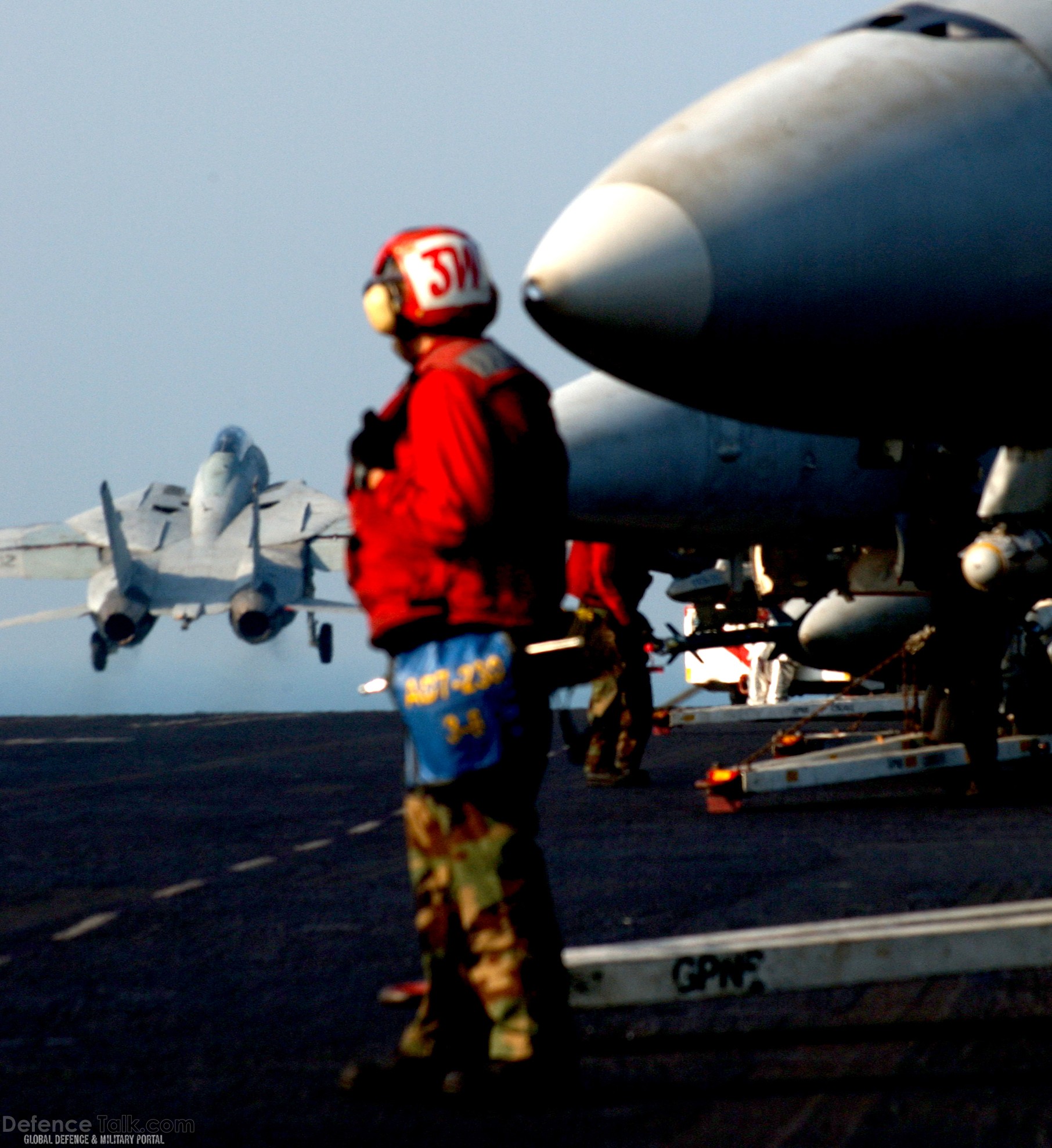 Persian Gulf (Dec. 9, 2005) - An Aviation Ordnanceman observes as an F-14D Tomcat, assigned to the âBlacklionsâ of Fighter Squadron Two One Three (VF-213), launches off the flight deck of the Nimitz-class aircraft carrier USS Theodore Roosevelt (CVN 71). Roosevelt and embarked Carrier Air Wing Eight (CVW-8) are currently underway on a regularly scheduled deployment conducting maritime security operations. U.S. Navy photo by Photographer's Mate 3rd Class Randall Damm