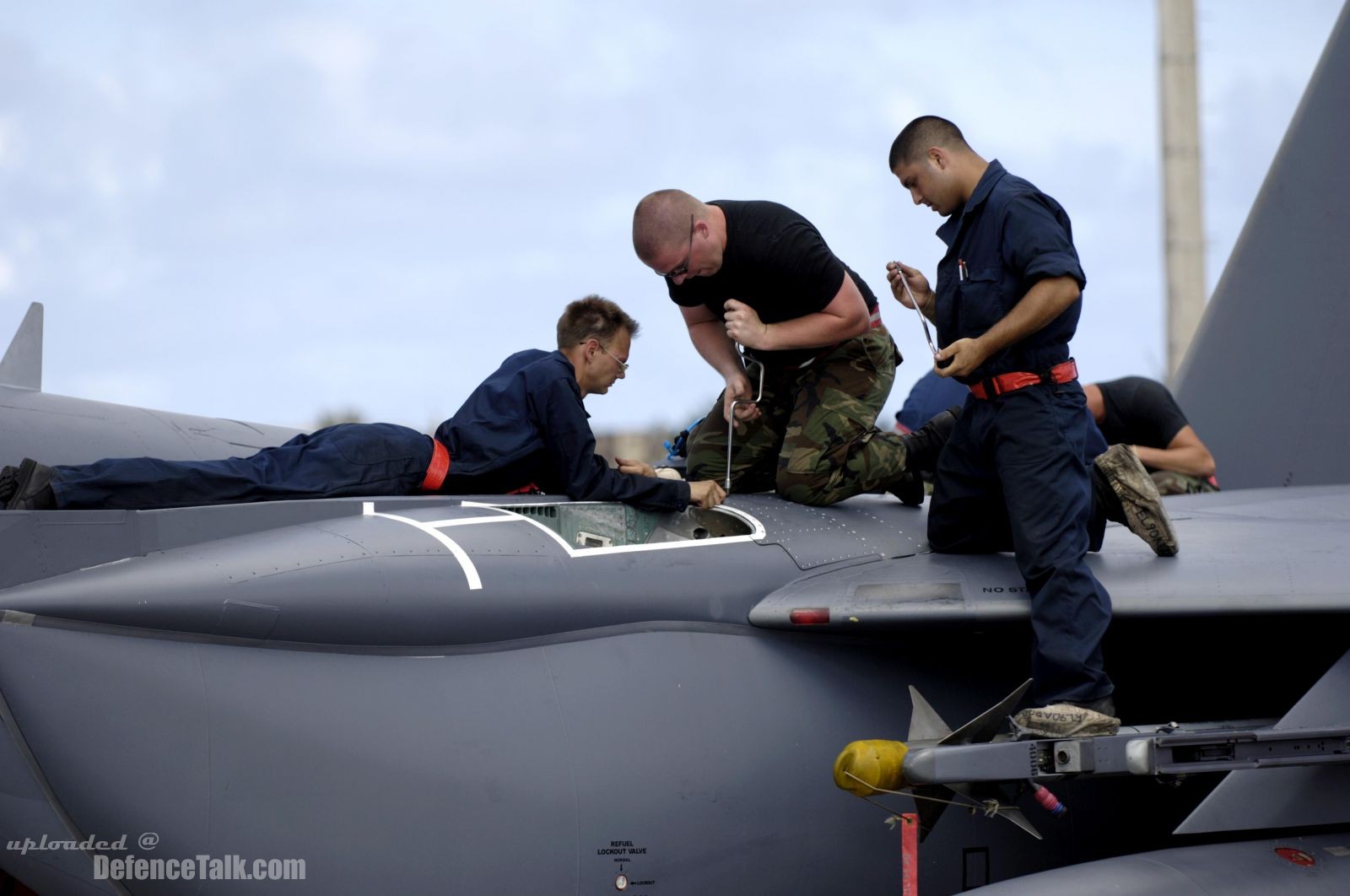 Aircraft maintainers work on their F-15E at Andersen Air Force Base, Guam June 20, 2006 during Exercise Valiant Shield 2006. The F-15E is from Elmendorf Air Force Base, Alaska. Valiant Shield 2006 an intergraded joint training exercise among U.S. military forces and is the first of what will become a biennial exercise. (U.S. Air Force photo by Tech. Sgt. Shane A. Cuomo)