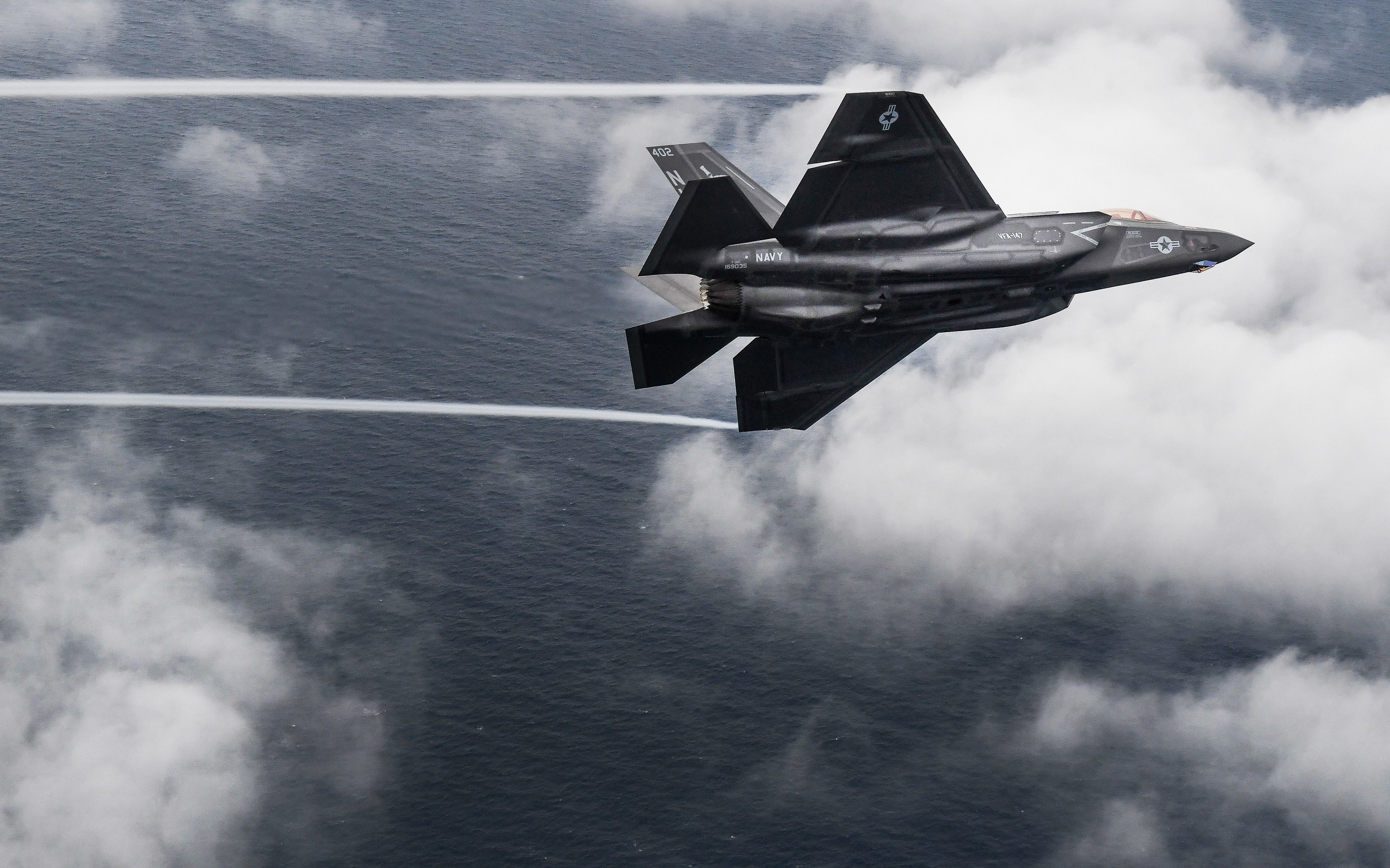An F-35C Lightning II attached to the "Argonauts" of Strike Fighter Squadron (VFA) 147, assigned to Commander, Joint Strike Fighter Wing, completes a flight over Eglin Air Force Base