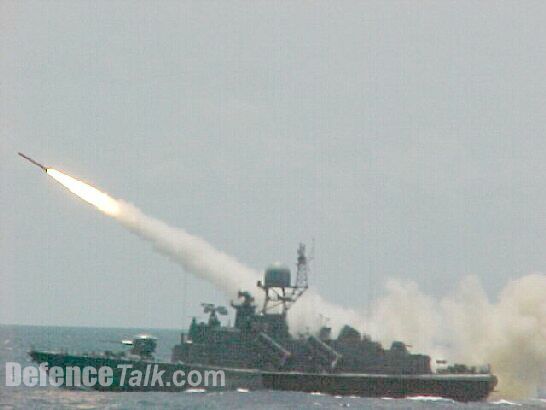 INS Prabal fires one of its 16 Kh-35 Uran missiles. First 11 Veer Class are fitted with 4 P-20M misslies, last two are fitted with 16 Kh-35 Uran