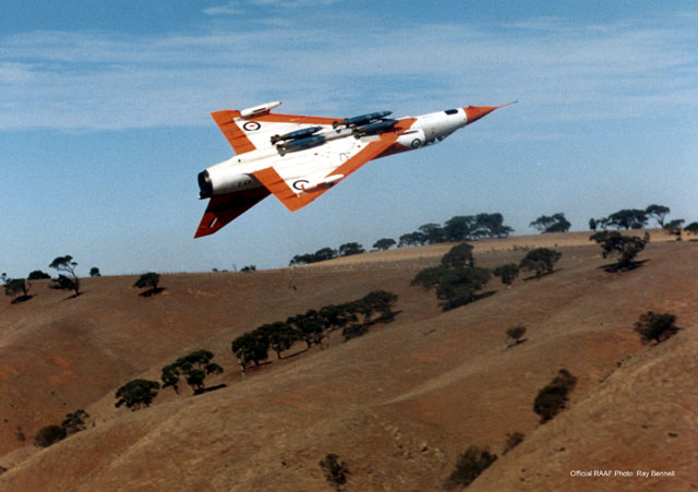 An early RAAF Mirage from the ARDU flight, belly up over St Marys Peak in South Australias Flinders Ranges
