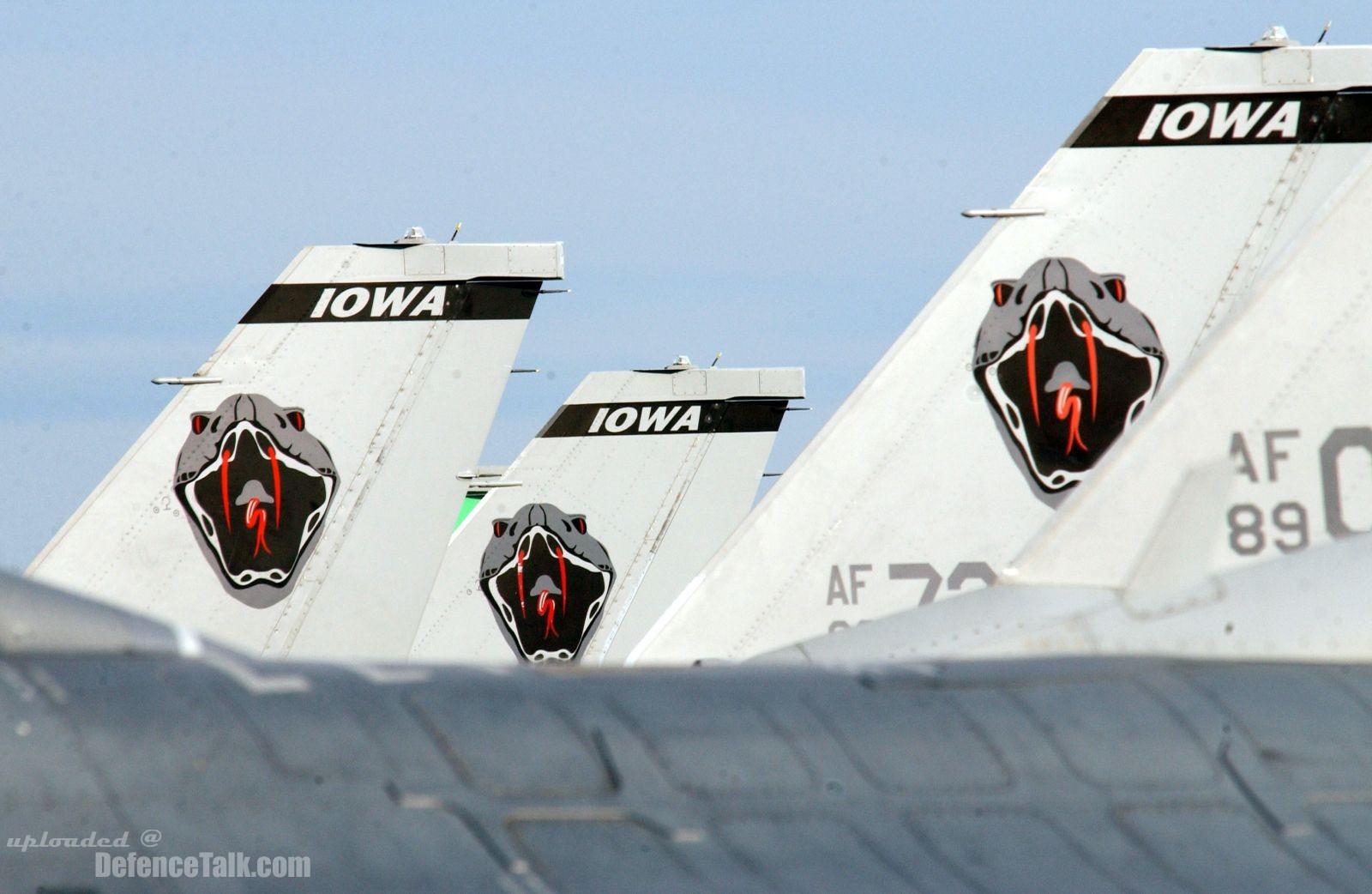 Three F-16 Fighting Falcons from the Iowa Air National Guard sit on the flightline at Eielson Air Force Base, Alaska, during exercise Northern Edge 2006 on Tuesday, June 6, 2006. The joint training exercise hosted by Alaskan Command is one of a series of U.S. Pacific Command exercises that prepare joint forces to respond to crises in the Asian Pacific region. (U.S. Air Force photo/Staff Sgt. Joshua Strang)