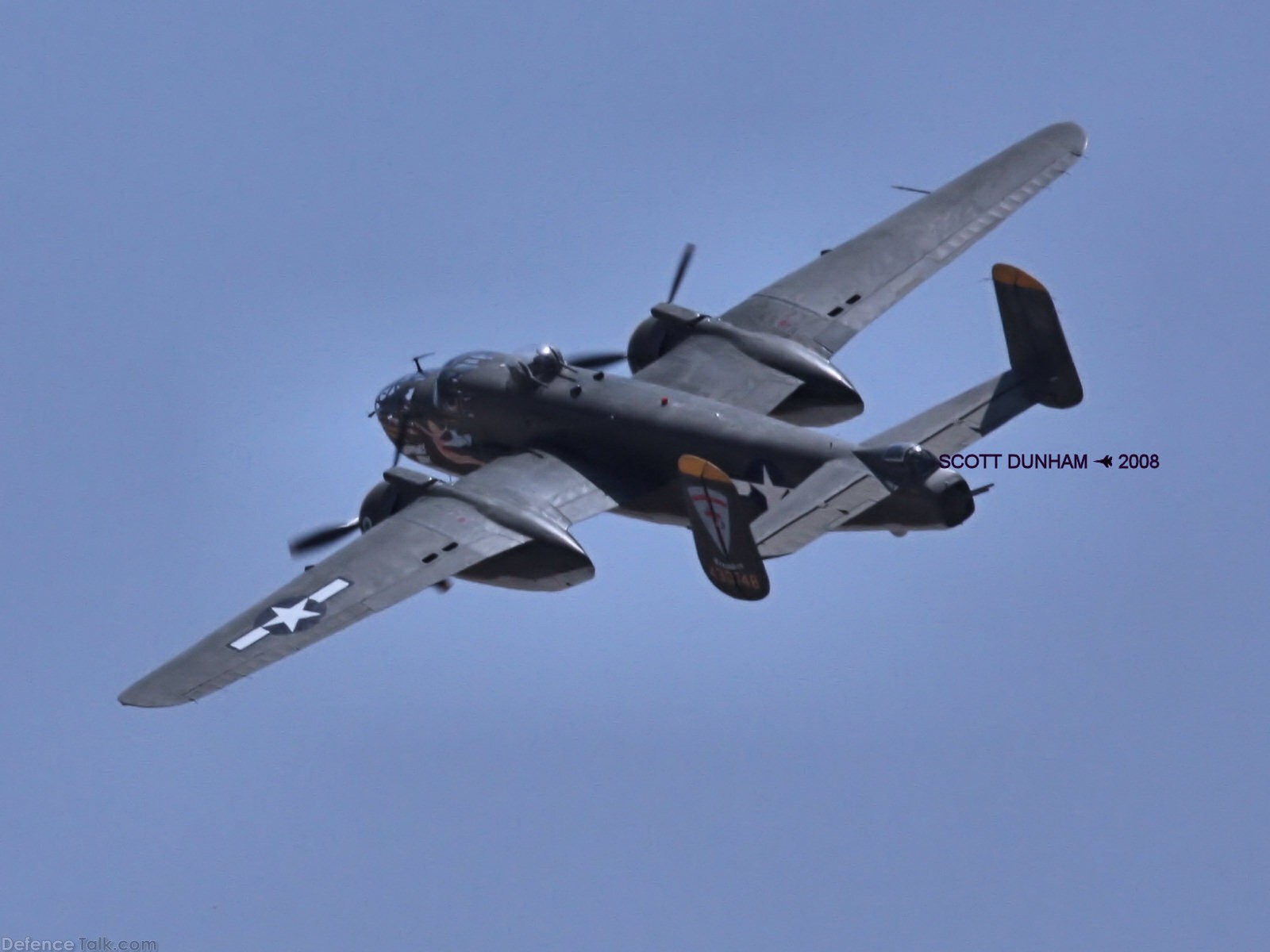 US Army Air Corps B-25 Mitchell Medium Bomber - WWII Aircraft. Air show flight demonstration. March Field, May 2008.