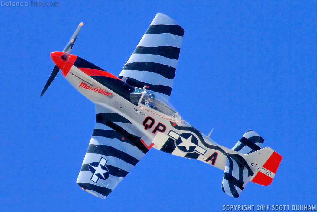 US Army Air Corps P-51 Mustang Fighter Aircraft. Air show flight demonstration, Thunder Over the Empire Air Show, March Air Reserve Base AirFest.