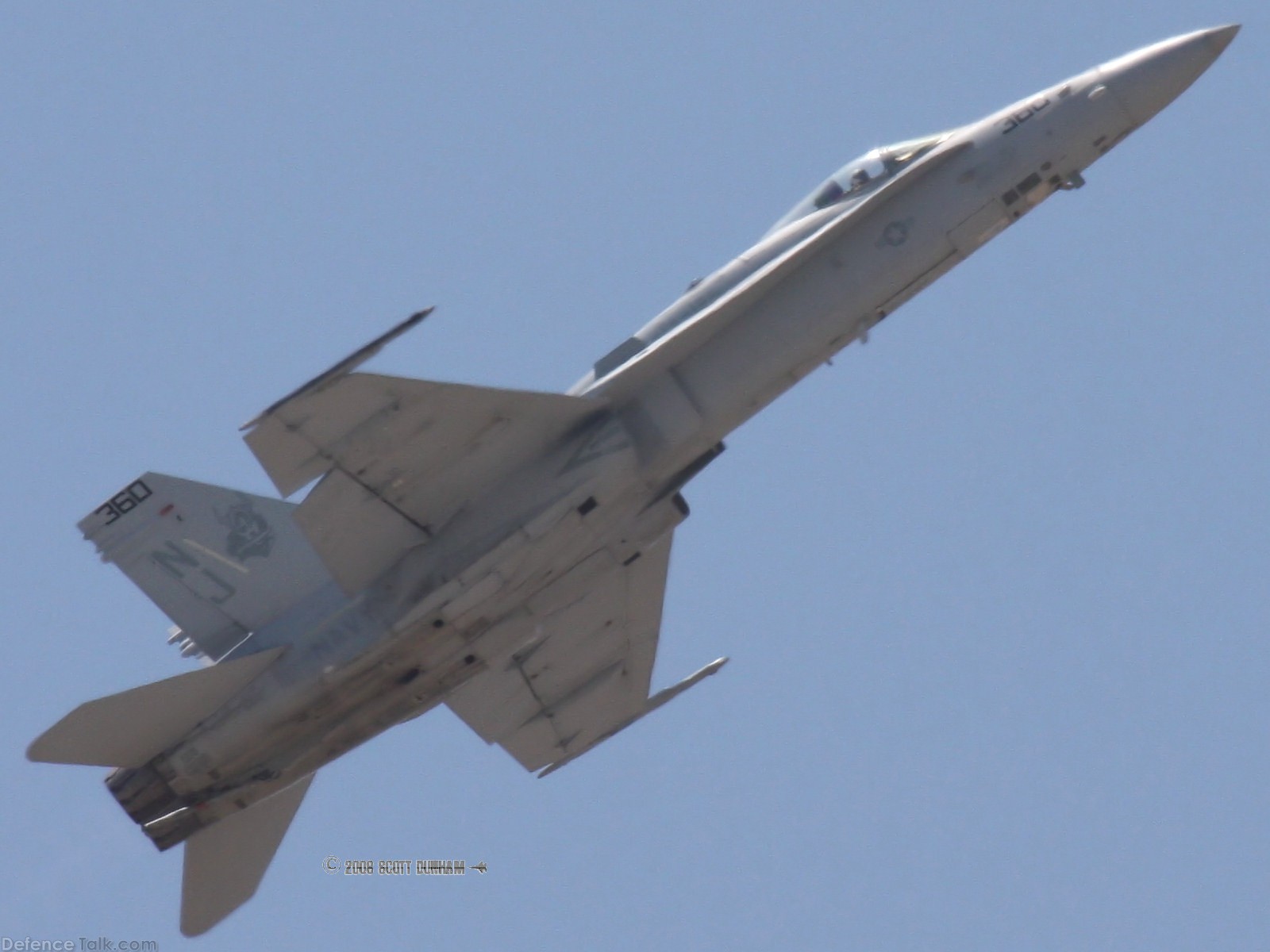 US Navy F/A-18C Hornet Fighter. Airshow flight demonstration. March Field, May 2008.