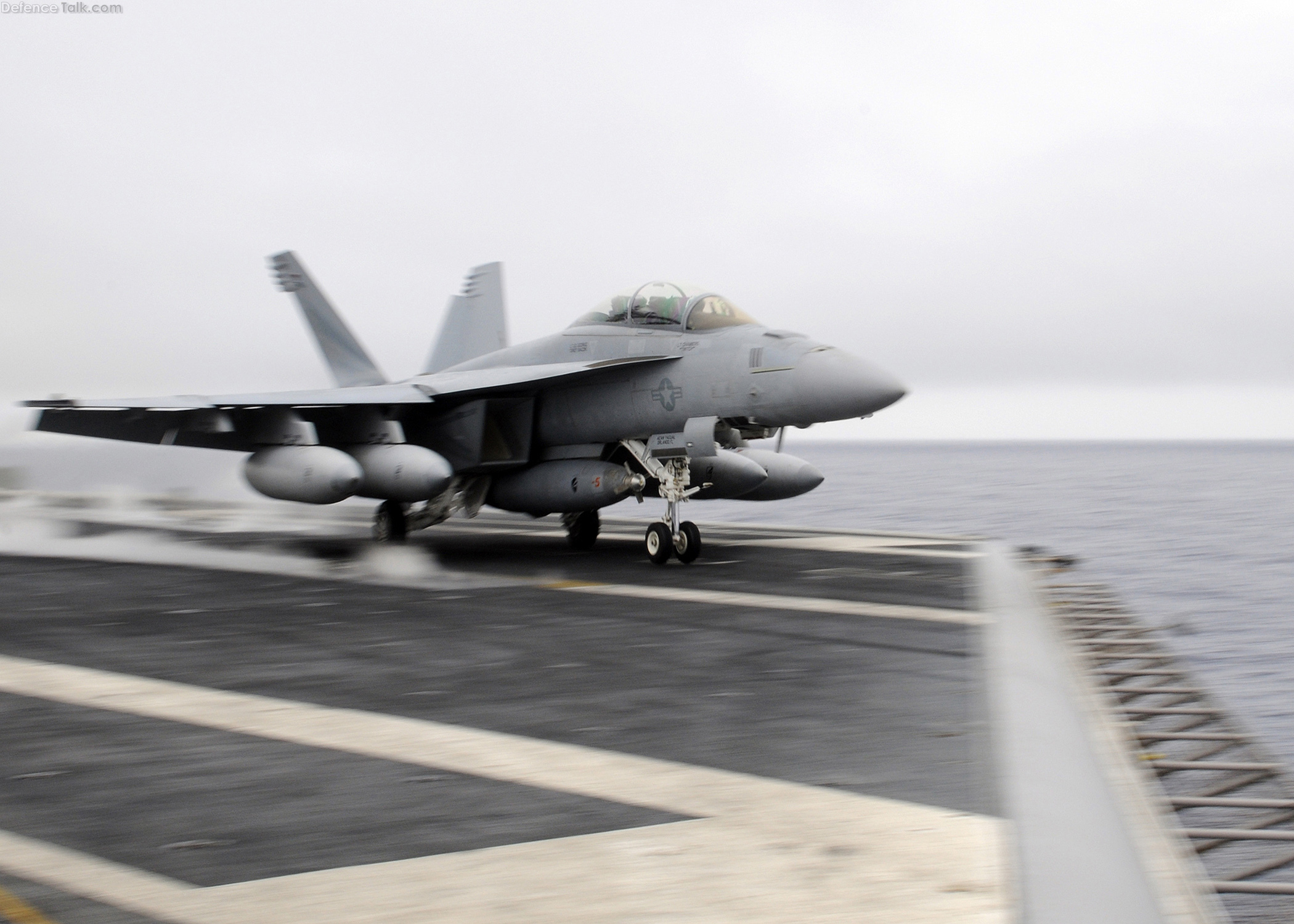 PACIFIC OCEAN (March 2, 2011) An F/A-18F Super Hornet assigned to the Argonauts of Strike Fighter Squadron (VFA) 147 launches from the aircraft carrier USS Ronald Reagan (CVN 76). The Ronald Reagan Carrier Strike Group is conducting training operations before deploying to the western Pacific Ocean and the U.S. Central Command area of responsibility. (U.S. Navy photo by Mass Communication Specialist 2nd Class Josh Cassatt/Released)