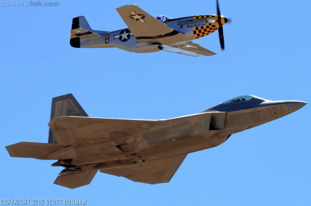 USAF Heritage Flight F-22A Raptor and P-51 Mustang Fighter Aircraft. Air show flight demonstration, Thunder and Lightning Over Arizona Air Show, Davis Monthan AFB.