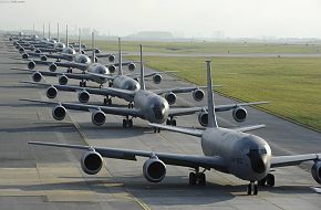 Twelve Air Force KC-135 Stratotankers, from the 909th Air Refueling Squadron, taxi onto the runway during Exercise Forceful Tiger on Kadena Air Base, Japan, April 1, 2015. During the aerial exercise, the Stratotankers delivered 800,000 pounds of fuel to approximately 50 aircraft...