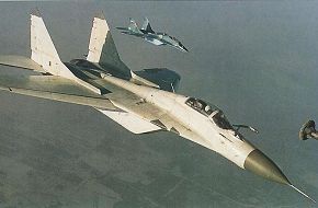MiG-29K prototype with a model Kh-31 (AS-17 âââ¬ÃÅKryptonâââ‰â¢) air-to-surface missile and two UK Royal Air Force Panavia Tornado GR1s from XV Sqn, Lossiemouth.